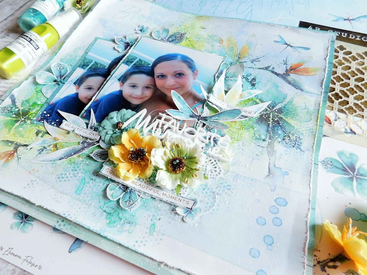 For this project I chose patterned papers from "Dream To Fly" collection by Romanticherie. The mists and the medium are 13@rts while the stencil is from AB Studio products. The photo is me and my little boy on a wonderful day by the sea last summer